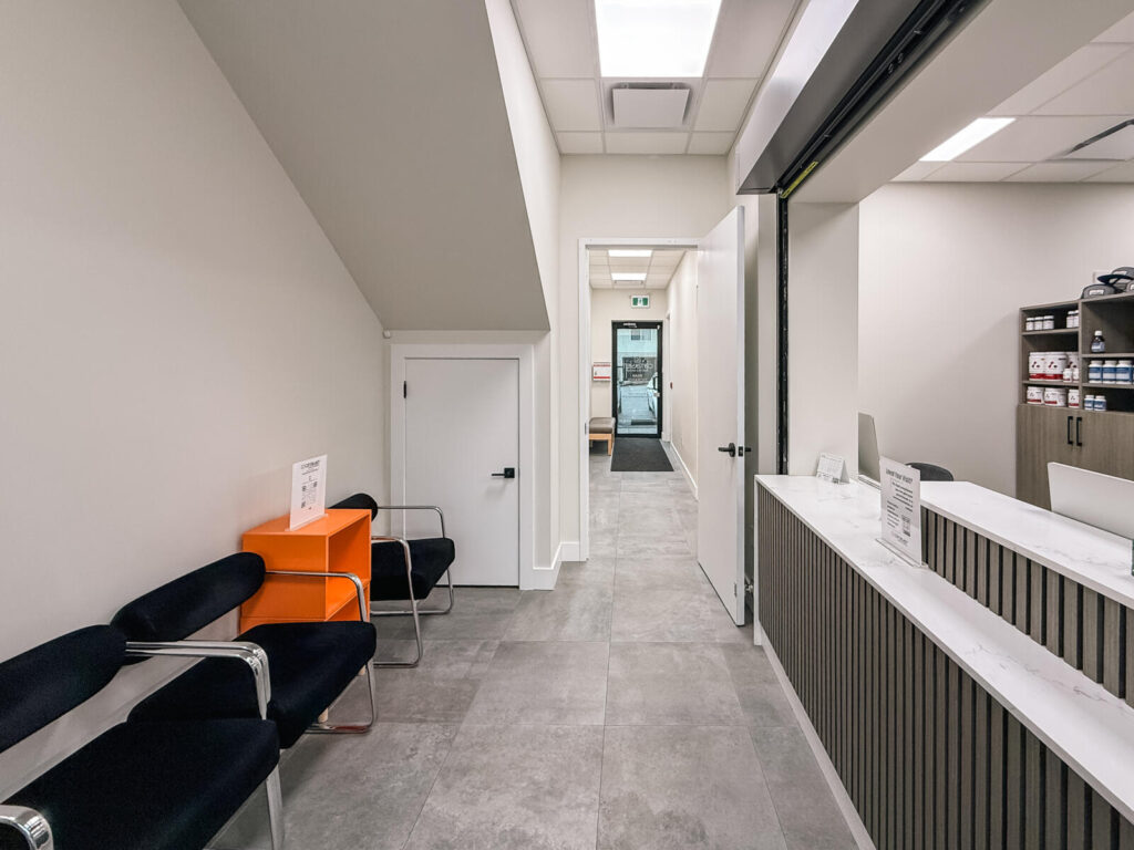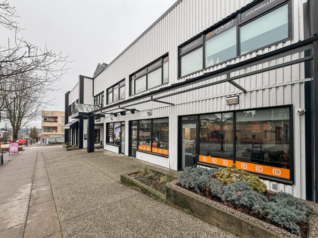 Catalyst Kinetics is a modern, two-level clinic located in New Westminster featuring a spacious ground-floor gym and multiple treatment rooms.
